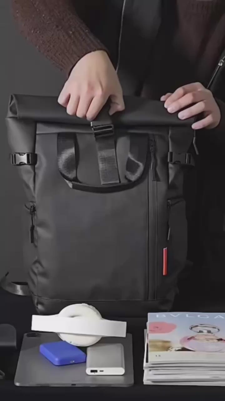 Der Rolltop-Reiserucksack T12 vereint modernen Stil mit praktischer Vielseitigkeit und ist damit der ideale Begleiter für Business, Studium und Reisen. Gefertigt aus strapazierfähigem Oxford-Gewebe und in elegantem Schwarz/Grau erhältlich, bietet dieser Rucksack ein großzügiges Fassungsvermögen von 20–39 Litern und einen verstellbaren Rolltop-Verschluss, der sich Ihren Bedürfnissen anpasst. Konzipiert als multifunktionale Computertasche, Schultasche und Umhängetasche bietet er neben Ihren Alltagsutensilien mühelos Platz für einen 16-Zoll-Laptop.